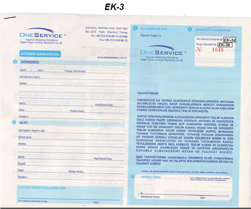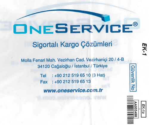 3. Oneservice güvenlik poşeti hasarlı veya güvenlik numaraları tutmuyor ise kargo yetkilisine hasar tespit tutanağı tutturularak kargonun teslim alınmaması gerekmektedir.